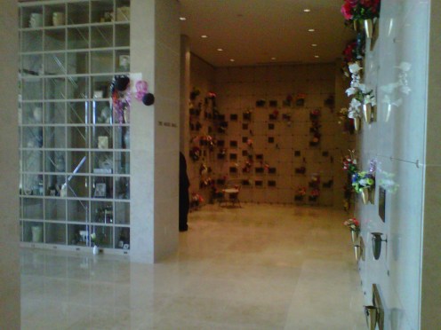 We drive down the hill, down the street, turn a corner and into Gate 10. I’m told that Gate 10 is near the Cherry Blossom garden. We enter the Lakeview IV mausoleum and go upstairs.